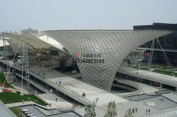 世博會(huì)期間,7000萬(wàn)參觀者中的23%將通過(guò)世博軸換乘地鐵、走進(jìn)場(chǎng)館,它將是園區(qū)人流交通的更主要主要通道。世博軸及地下綜合體,簡(jiǎn)稱(chēng)世博軸,是由二層地下空間、地面層、10米高架平臺(tái)、屋頂索膜結(jié)構(gòu)及陽(yáng)光谷結(jié)構(gòu)共同組成。世界規(guī)模更大的連續(xù)張拉索膜結(jié)構(gòu);世博軸索膜結(jié)構(gòu)是迄今為止世界規(guī)模更大的連續(xù)張拉索膜結(jié)構(gòu),膜材選用了一種名為PTFE(聚四氟乙烯)的涂層玻璃纖維,具有不易燃性、防紫外線、抗風(fēng)化、自潔性、高反射性等特點(diǎn),完全可以適應(yīng)上海地區(qū)的臺(tái)風(fēng)氣候,“陽(yáng)光谷索膜結(jié)構(gòu)只有在十級(jí)以上的風(fēng)力,才會(huì)出現(xiàn)明顯的位移,這個(gè)位移也在可以控制的范圍之內(nèi)。”陽(yáng)光谷建筑負(fù)責(zé)人驕傲的告訴記者。上海世博會(huì)工程建設(shè)指揮部辦公室的市政項(xiàng)目部總經(jīng)理趙克平透露,張拉膜總面積約77224m2,更大跨度約97米,由31個(gè)外側(cè)桅桿,19個(gè)下拉點(diǎn)以及18個(gè)與陽(yáng)光谷的拉接點(diǎn)通過(guò)13種不同功能索張拉而成,膜片數(shù)量69片,其中更大的膜單片面積達(dá)1780m2。