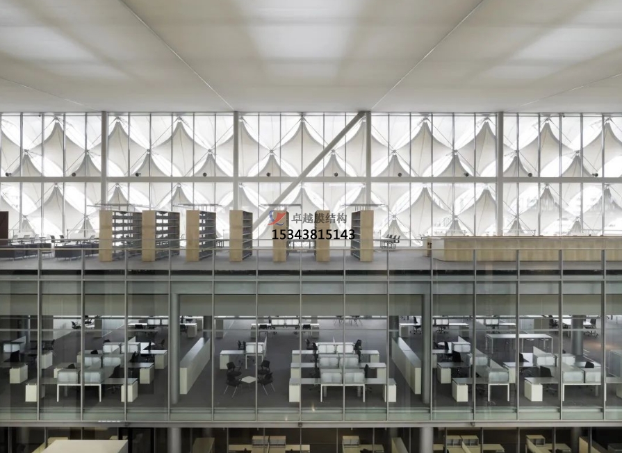 膜結(jié)構(gòu)頂棚是一種現(xiàn)代化的建筑形式,利用高強(qiáng)度柔性薄膜材料與支撐體系相結(jié)合,形成具有一定剛度和獨(dú)特曲面的覆蓋結(jié)構(gòu)。這種結(jié)構(gòu)不僅美觀大方,而且具有良好的透光性和節(jié)能效果,適用于各種公共建筑,包括圖書(shū)館。