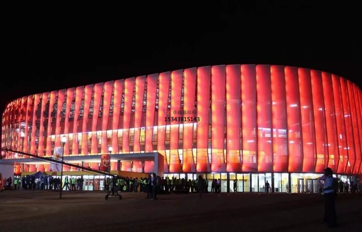 膜材是在聚酯纖維編織成的基布上涂敷PVC(聚氯乙烯)樹脂而形成的復(fù)合材料,非常的具有技術(shù)含量,其曲面可以隨著建筑師的設(shè)計需要任意變化,結(jié)合整體環(huán)境,建造出標(biāo)志性的形象工程。