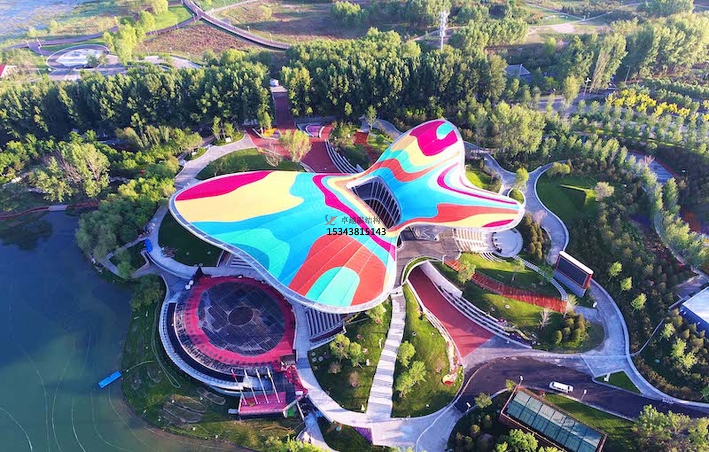 ETFE膜材除了常規(guī)的透明、藍色、白色、銀色鍍點外,其實還有五顏六色的彩色系列。今天就給大家介紹一個ETFE彩色膜應用的經(jīng)典案例:2019的北京世園會的主場館——媯汭劇場,外觀為彩色蝴蝶造型。