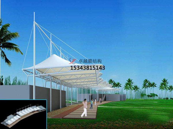 這種建筑以膜材、鋼索和支柱組成,利用鋼索與支柱在膜材中導(dǎo)入張力以達(dá)安定的形式。優(yōu)點(diǎn)具有結(jié)構(gòu)性能強(qiáng)且美觀的造型。不過由于這種張拉膜工程要求的施工精度很高,雖然后期維護(hù)費(fèi)用不高,但是工程造價(jià)就高于骨架式膜結(jié)構(gòu)。