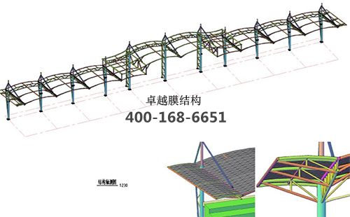 本工程膜材采用白色高端國(guó)產(chǎn)膜材PVDF高自潔環(huán)保建筑膜材,鋼結(jié)構(gòu)采用更好的標(biāo)準(zhǔn)Q235B鋼材,表面采用酚醛底漆處理,面漆采用白色鋼結(jié)構(gòu)專(zhuān)用快干磁漆。
