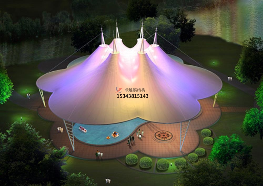 膜結(jié)構(gòu)景觀是一種全新的建筑結(jié)構(gòu)形式,它集建筑學(xué)、結(jié)構(gòu)力學(xué)、精細化工與材料科學(xué)、計算機技術(shù)等為一體,具有很高技術(shù)含量。其曲面可以隨著建筑師的設(shè)計需要任意變化,結(jié)合整體環(huán)境,建造出標志性的形象工程。