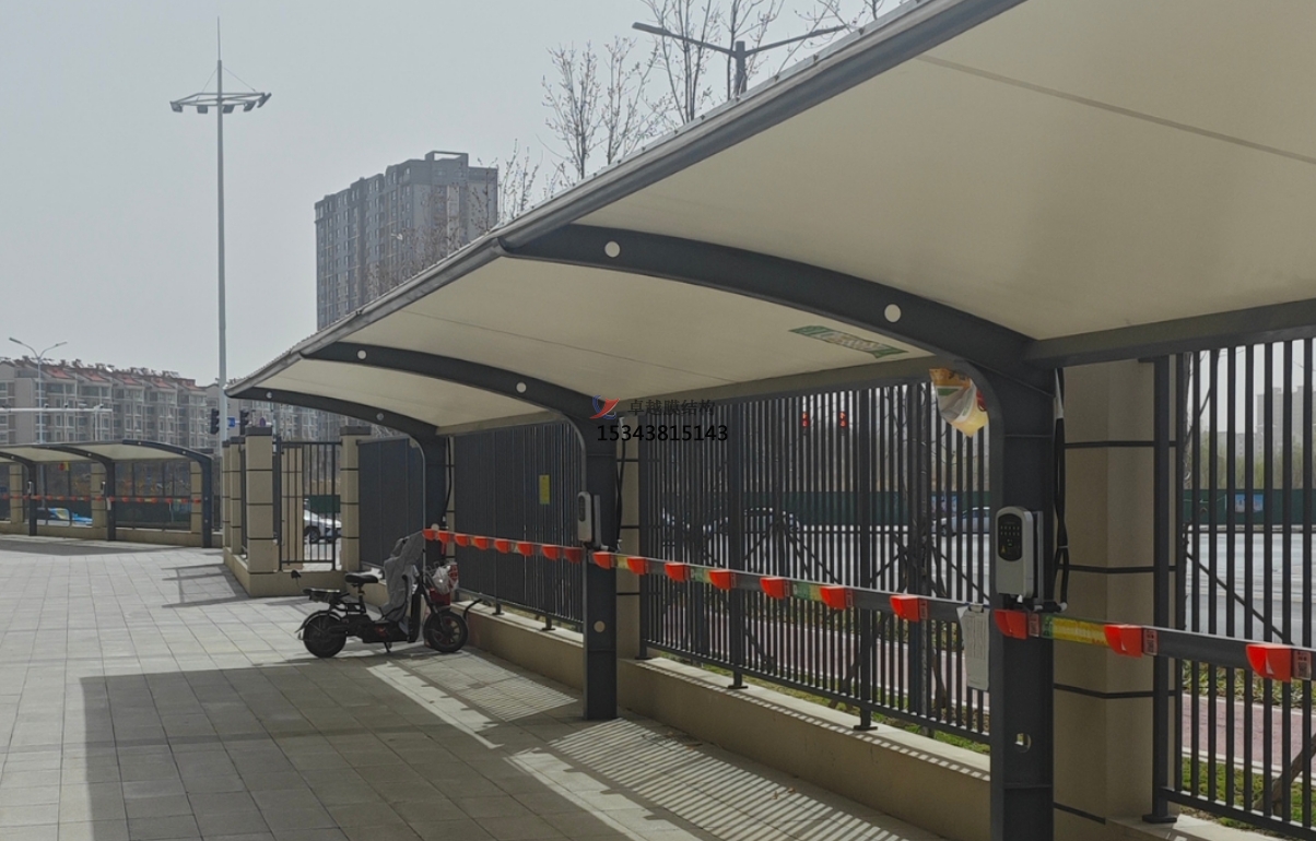 膜結(jié)構(gòu)車棚的外觀極具現(xiàn)代感和藝術(shù)氣息。其流暢的曲線和多變的造型,突破了傳統(tǒng)車棚的呆板形象。有的車棚如優(yōu)雅的風(fēng)帆,在微風(fēng)中似乎即將起航;有的則像靈動的飛鳥,輕盈地棲息在城市空間。這種獨特的設(shè)計不僅為車輛提供了遮蔽場所,更成為了城市中的一道亮麗風(fēng)景線,與周圍環(huán)境相得益彰,提升了整體空間的美感。