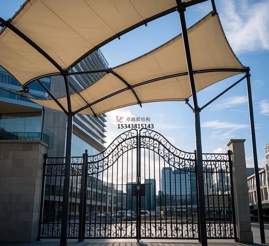 膜結構大門還具備良好的遮陽功能。炎炎夏日,膜材能夠為居民撐起一片清涼的空間,無論是步行進出小區(qū)的居民,還是在門口短暫停留等待的人員,都能免受烈日的炙烤。部分膜材具有一定的透光性,在遮陽的同時,還能讓自然光適度透入,使大門內(nèi)部空間明亮舒適,避免因光線不足而產(chǎn)生的昏暗壓抑感。此外,膜結構大門還可以根據(jù)需要設置一些附屬設施,如在大門兩側安裝宣傳欄,用于發(fā)布小區(qū)通知、活動信息等,方便居民及時了解小區(qū)動態(tài)。
