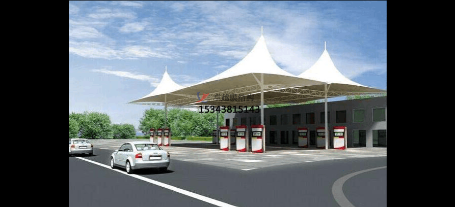 二、加油站頂棚并不是傳統(tǒng)意義上的一個(gè)遮陽(yáng)擋雨的覆蓋頂棚,隨著人們審美的不斷提高,除了要求頂棚具有實(shí)用性功能外,還要有一定的美觀性,因此,在充分發(fā)揮膜布的性能條件下,搭配先進(jìn)的張拉技術(shù),可以將頂棚張拉成不同的形狀,使加油站更具有藝術(shù)美感。