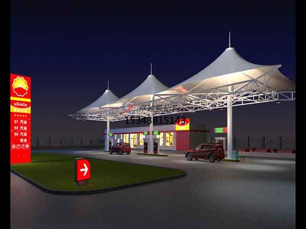 加油站膜結(jié)構(gòu),荷載態(tài)分析:張拉膜結(jié)構(gòu)自身重量很輕,僅為鋼結(jié)構(gòu)的1/5,混凝土結(jié)構(gòu)的1/40;因此膜結(jié)構(gòu)對(duì)地震力有良好的適應(yīng)性,而對(duì)風(fēng)的作用較為敏感。此外還要考慮雪荷載和活荷載的作用。