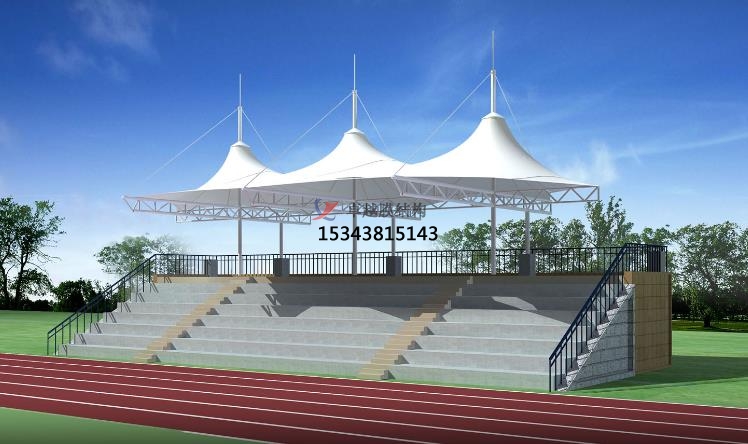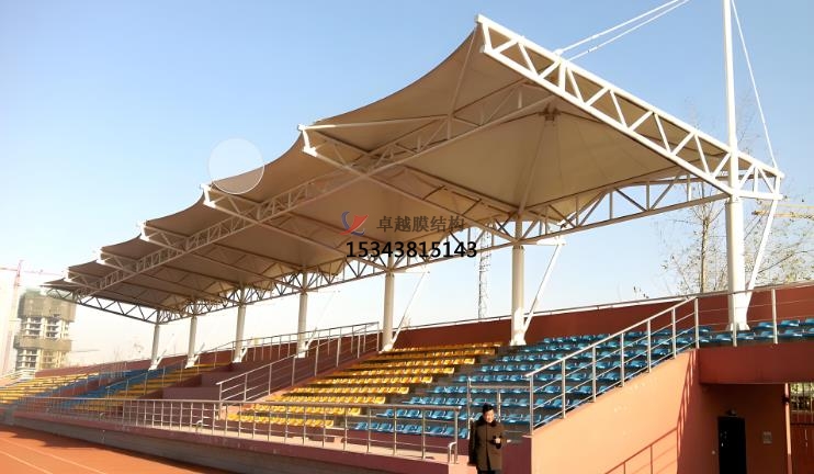 看臺張拉膜的功能:遮陽擋雨,環(huán)保節(jié)能,安全可靠,靈活定制??磁_張拉膜為觀眾提供了寬敞舒適的坐席,膜材透光性可提供所需照度,實現(xiàn)自然采光與人工采光結合,節(jié)省照明能耗,且夜間在燈光映射下形成絢麗景觀,同時具備遮陽擋雨的功能,確保在各種天氣條件下都能提供良好的觀賽體驗。采用可回收材料,生產(chǎn)消耗資源少,能反射陽光降低內(nèi)部溫度,減少空調(diào)使用,符合綠色建筑理念。由于其輕質(zhì)特性,看臺張拉膜對基礎的需求較低,減少了建筑材料的消耗,高質(zhì)量張拉膜強度高、抗腐蝕性能佳,能抵御紫外線、風霜雨雪等自然因素影響,長期使用無需頻繁大規(guī)模耗資維修保養(yǎng)。看臺張拉膜結構設計要求合理安全,首先應用支承結構的穩(wěn)定性,方便張拉膜面時把握控制點空間位置及實施張拉,膜材撕裂時不至于結構整體倒塌,更換膜面施工方便。然后利用水平力的傳遞,采用合適構造措施確保作用于膜面的荷載以膜面張力形式通過邊界索經(jīng)膜角節(jié)點板傳遞到支承結構或基礎時,水平力可靠傳遞。其次利用結構體系內(nèi)力的自平衡,將支承結構體系設計成自平衡體系,減少膜面張力對下部結構或地基的影響。最后根據(jù)結構單元的重復與組合,利用基本外形的機構單元組合形成大面積覆蓋空間時,注意膜面的熱合線在連接處要對齊,形成連續(xù)、流暢視覺效果。膜材料和支撐構件經(jīng)嚴格檢測認證,設計施工考慮防火、防腐蝕等安全因素,結構穩(wěn)定性好,發(fā)生意外坍塌危險性小。看臺張拉膜可以根據(jù)具體需求進行量身定制,適應各種形狀和尺寸,完美契合不同場合。