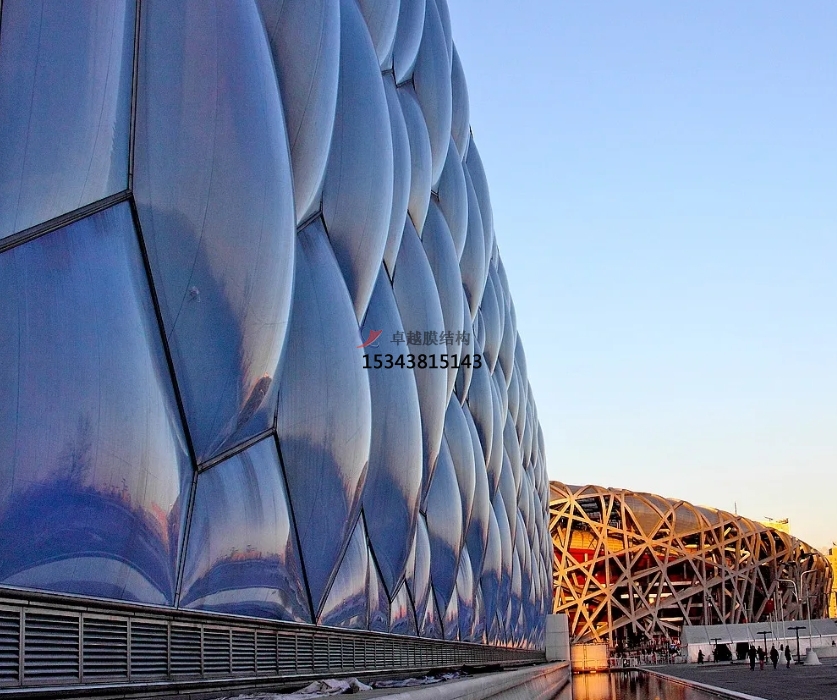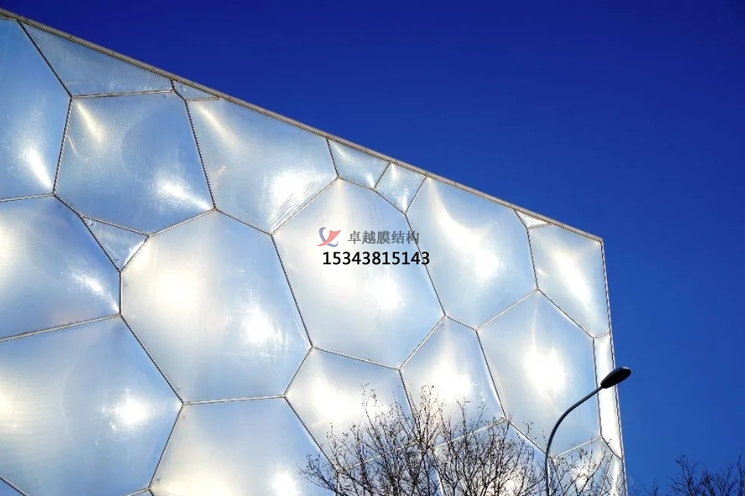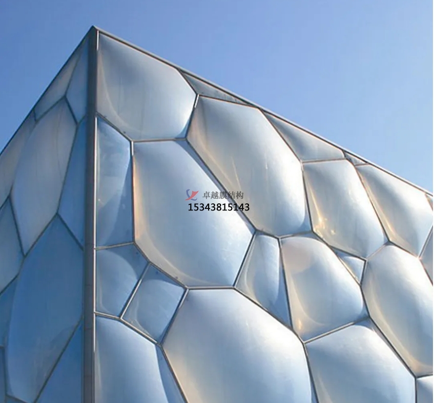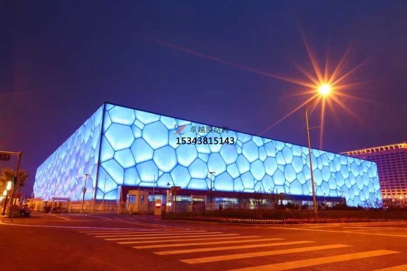 水立方是一座長寬177米乘177米,高31米的方型建筑,形狀看似隨意的建筑立面,但遵循著嚴格的幾何規(guī)則。水立方的幕墻由3800多個ETFE(四氟乙烯)氣枕組成,共有11種不同的形狀,內(nèi)層和外層均安裝充有惰性氣體的枕頭。