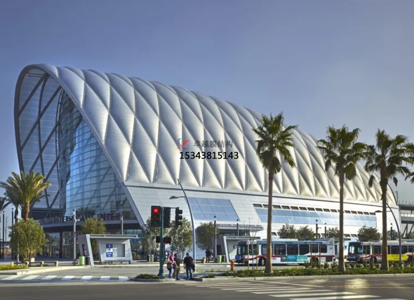 美國南加州新一代公共交通設(shè)施:阿納海姆地區(qū)聯(lián)合運輸中心。阿納海姆地區(qū)聯(lián)合運輸中心建筑面積為67000平方英尺,建筑表皮采用菱形鋼拱的網(wǎng)格結(jié)構(gòu)系統(tǒng),由ETFE氣枕膜結(jié)構(gòu)組成。大跨度的網(wǎng)殼結(jié)構(gòu)創(chuàng)造的中庭空間寬敞明亮,可容納川流不息的人群。ETFE穹頂和膜結(jié)構(gòu)幕墻,一掃傳統(tǒng)火車站繁冗、沉重、空間昏暗的弊端,帶來一股清新簡潔的交通設(shè)施建筑風(fēng)格。