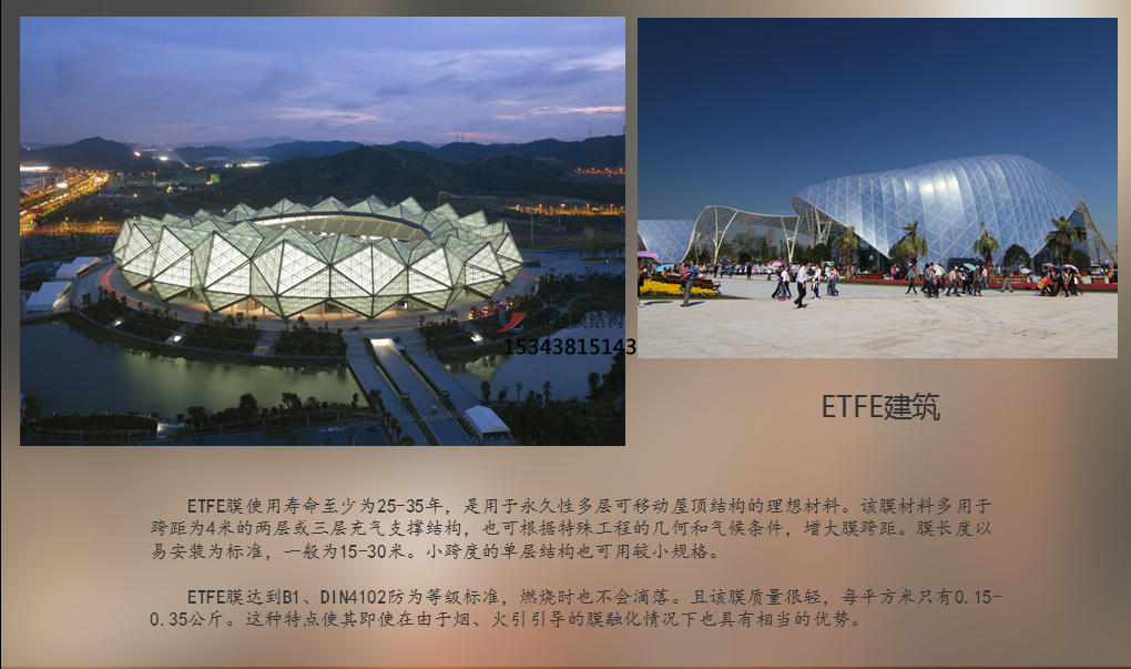 - 乙烯 - 四氟乙烯共聚物(ETFE)膜材:透光性高達(dá) 95% 以上,質(zhì)量輕,只有同等大小玻璃的 1%,韌性好、抗拉強(qiáng)度高、不易被撕裂,耐候性和耐化學(xué)腐蝕性強(qiáng),熔融溫度高達(dá) 200℃。