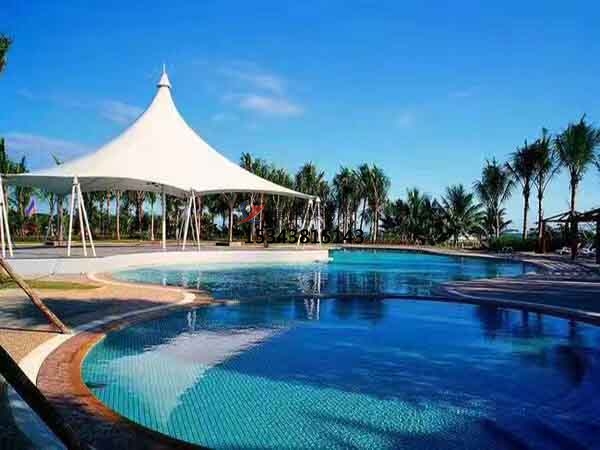 坐落吉隆坡的馬來西亞更好的體育中心游泳館膜頂取舍規(guī)劃更具裝飾性。拼縫全體上是流通的曲線,其間點綴著幾個巨大的花形圖畫,而花心處恰恰是膜面的支點。花朵圖畫的拼縫設(shè)計既清晰表達(dá)了其受力聯(lián)系,也有助動了解膜面的全體形狀。頂棚的全體作用猶如活動的水面上浮著幾朵花瓣,跳動的圖畫給室內(nèi)帶來愉快的氣氛。