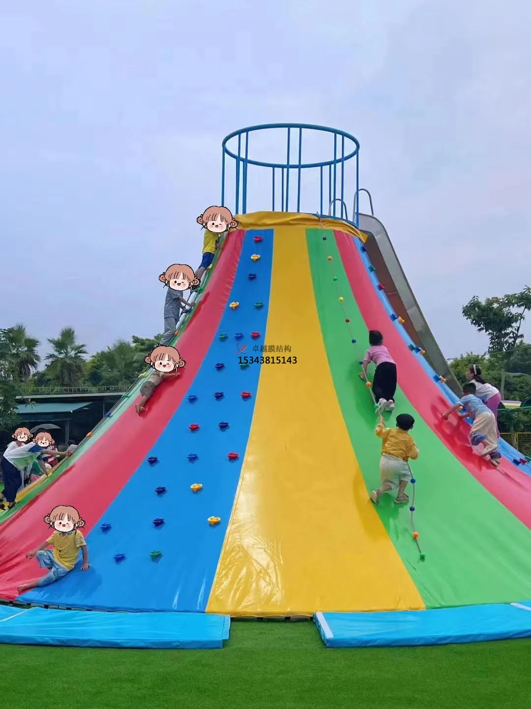 小朋友們可以從底部貼緊“火山”,雙手抓住巖石向上攀登,當成功攀巖到山頂時,可以從“火山”頂部通過滑梯或者“火山”表面滑下來。