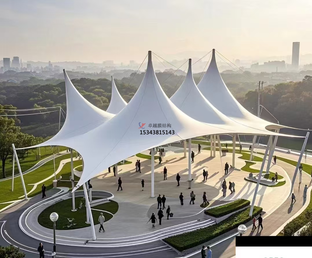 膜結(jié)構(gòu)具有高度的可塑性和適應(yīng)性,可根據(jù)場(chǎng)地的大小和形狀進(jìn)行設(shè)計(jì),使休閑廣場(chǎng)將建設(shè)具有更大的靈活性。