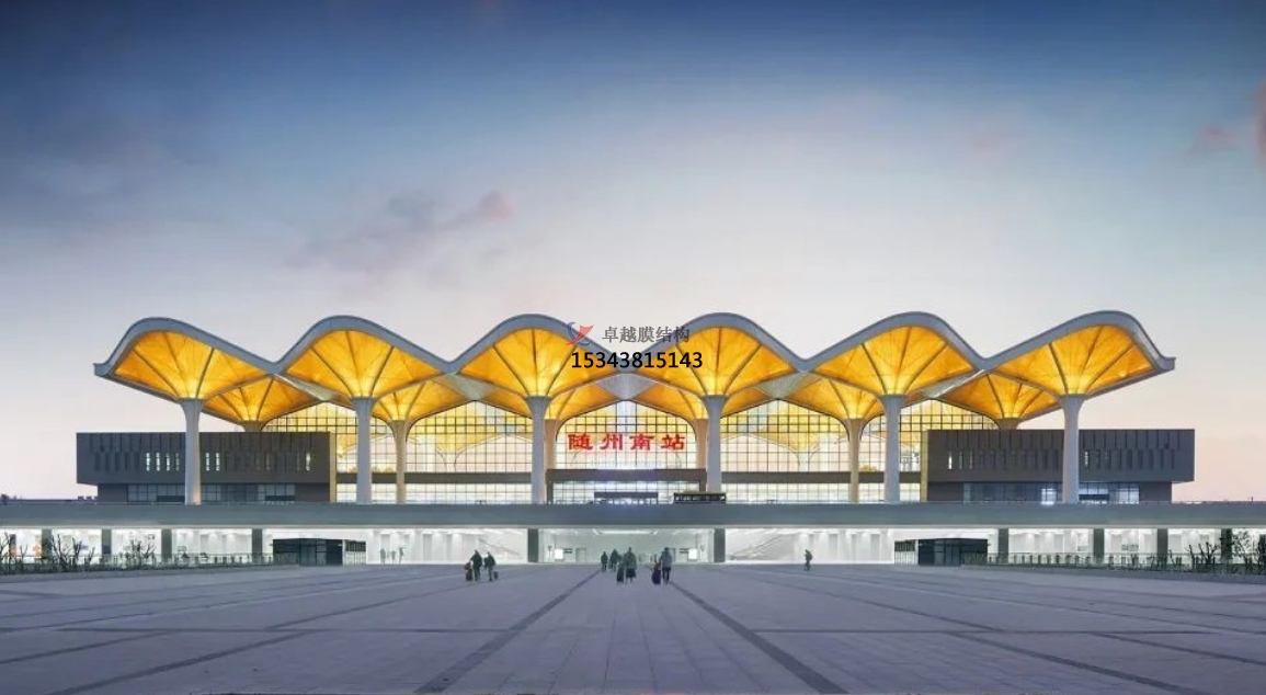 隨州高鐵站:隨州高鐵站站房采用了膜結(jié)構(gòu)設(shè)計(jì),通過(guò)驗(yàn)算不同膜材的最大適用跨度,最終選用了滿(mǎn)足要求的膜材方案。該站房膜結(jié)構(gòu)造型獨(dú)特,既美觀(guān)又實(shí)用,成為隨州市的新地標(biāo)。