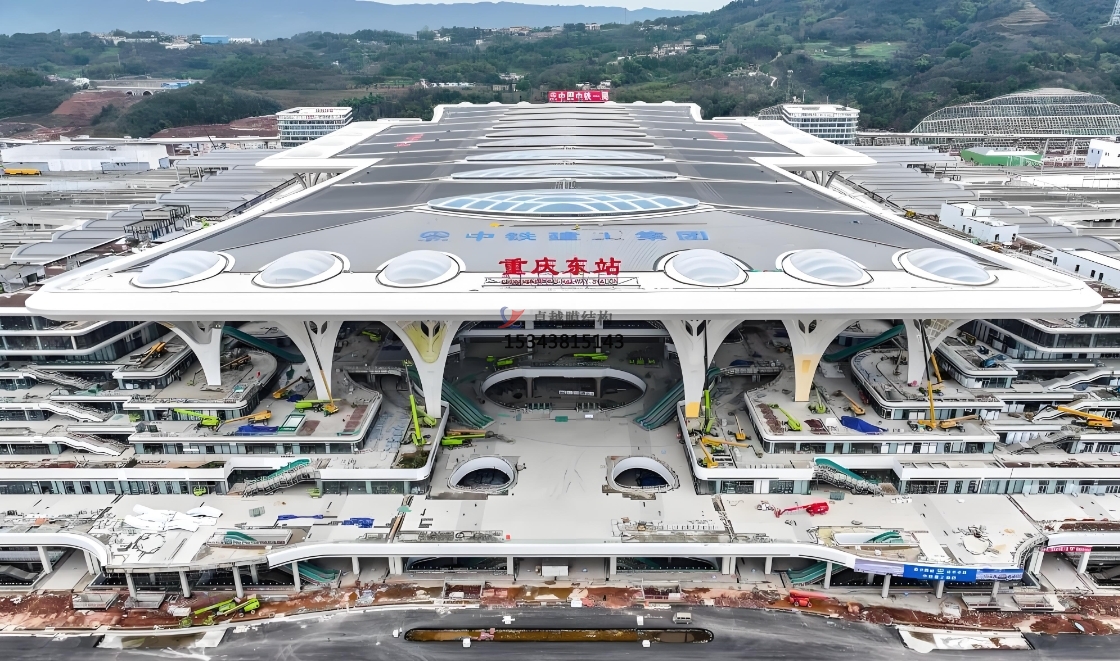 重慶東站:正在建設(shè)的重慶東站屋蓋體系采用了“管桁架鋼結(jié)構(gòu)+橢圓形天窗+樹(shù)形支撐柱+ETFE氣枕膜”形式。這種設(shè)計(jì)不僅實(shí)現(xiàn)了大跨度的覆蓋,還通過(guò)ETFE氣枕膜的應(yīng)用為整個(gè)項(xiàng)目增添了獨(dú)特的視覺(jué)效果。