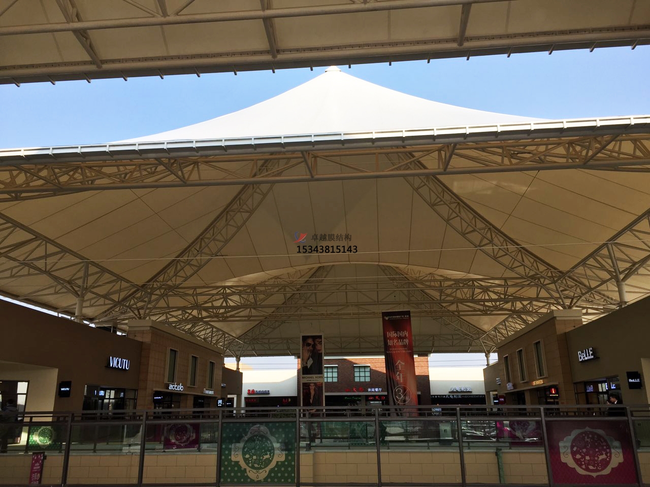 商業(yè)街在城市中占有相當(dāng)大的比重。商業(yè)街的建筑與環(huán)境是城市文明的窗口,代表著物質(zhì)文明和精神文明的水平,同時(shí),也是景觀環(huán)境的重要組成部分。張拉膜輕巧別致極具現(xiàn)代化風(fēng)格,且易于安裝移動(dòng),在商業(yè)街設(shè)計(jì)中得以廣泛應(yīng)用。