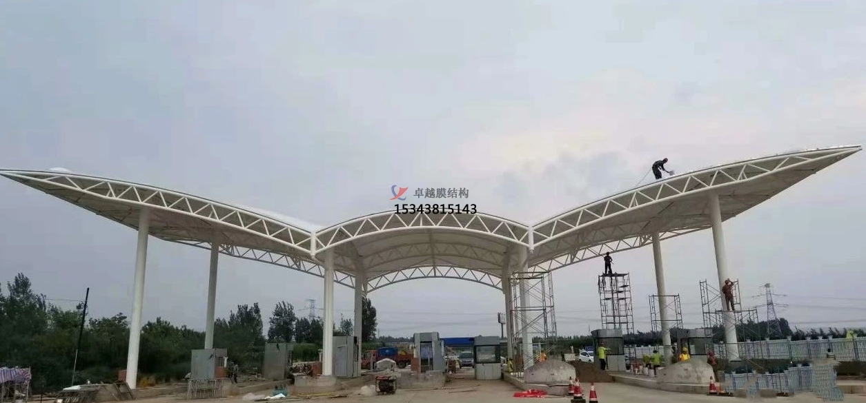 張拉式、骨架式、索膜式等結構形式,結合 BIM 技術優(yōu)化曲面形態(tài),既滿足力學需求,又實現(xiàn) “建筑即雕塑” 的美學效果。例如,陸屋鎮(zhèn)高速收費站采用 PTFE 膜與鋼結構結合,通過預張拉技術形成流暢的曲線造型,成為區(qū)域地標。