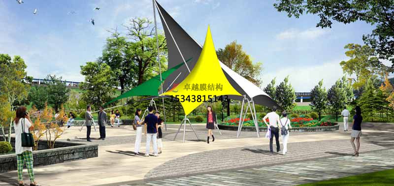 4、張拉膜景觀施工時,需采用吊裝法進行施工。根據(jù)平面位置,將張拉膜分為幾個操作板,每個板需要采用吊裝的方法進行操作。我用的提塊法把所有膜體分成五個工作塊,一個和第個,第三個和第四個,第五個和第六個,第七個和第八個,第九個和第十個。當所有膜體達到設(shè)計方案的高度時,每個工作塊在空氣中連接在一起,具有非常顯著的優(yōu)勢。在整個安裝過程中,應(yīng)避免膜在風荷載作用下過度晃動。