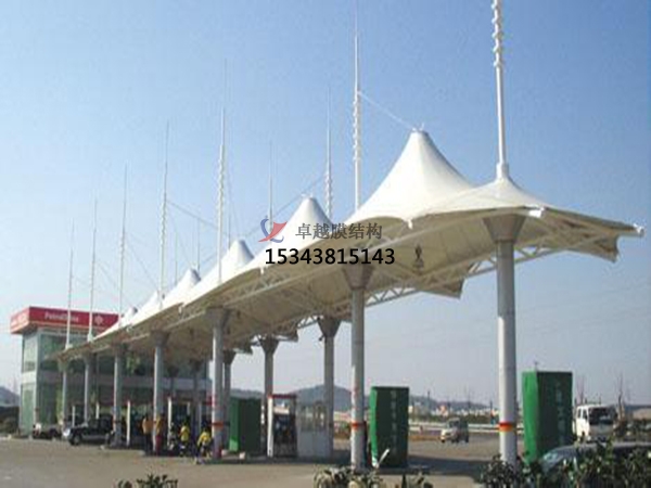 張拉式膜結(jié)構(gòu),以膜材,鋼索及支柱構(gòu)成,運(yùn)用鋼索與支柱在膜材中導(dǎo)入張力以達(dá)安靖的方法,除了可實(shí)踐具有構(gòu)思,立異且美麗的造型外也是能展現(xiàn)膜結(jié)構(gòu)精力的結(jié)構(gòu)方法,近年雨棚來(lái),大型跨距空間也多選用以鋼索與緊縮材料構(gòu)成鋼索網(wǎng)來(lái)支撐上部膜材的方法,加氣站雨棚施工精度要求高,結(jié)構(gòu)功用強(qiáng),且具豐盛的表現(xiàn)力。