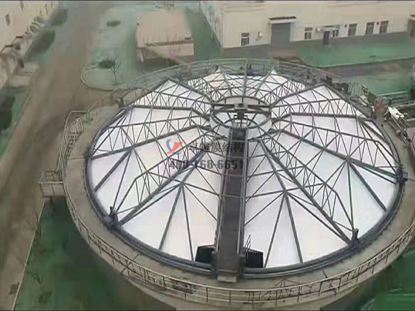 1.該項(xiàng)目是孝感污水廠污水池加蓋工程,所含污水池總面積共計(jì)為991m²,采用隨動(dòng)式鋼架反吊膜.
