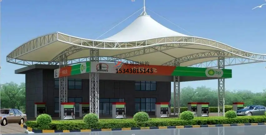 加油站的張拉膜棚是一種覆蓋于加油站建筑之上的膜結構,可提供遮陽、擋雨、增加空間利用率等多種功能。這種膜結構由鋼索和膜材組成,通過張拉的方式形成穩(wěn)定的形狀和結構。