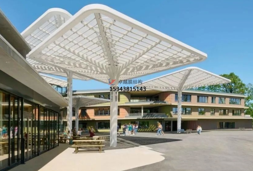 膜結(jié)構(gòu)景觀可以采用多種形狀和顏色的膜材料,通過張力和支撐系統(tǒng)來實現(xiàn)懸掛和張拉的效果,其設(shè)計靈感來自于自然界中的形態(tài)和結(jié)構(gòu),如植物葉片、動物骨骼等,常見的應用包括遮陽棚、入口門廊、地標建筑等等。