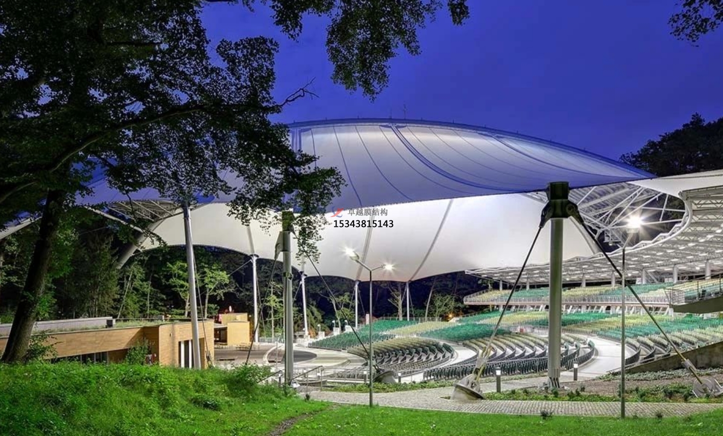 舞臺(tái)膜結(jié)構(gòu)遮陽(yáng)棚的膜材料具有一定的透光性,可以根據(jù)演出需要調(diào)節(jié)光線(xiàn)的明暗和色彩。在白天,自然光透過(guò)膜材料灑落在舞臺(tái)上,為演出增添了一份自然和溫馨;在夜晚,舞臺(tái)燈光與膜材料的透光性相結(jié)合,可以營(yíng)造出夢(mèng)幻般的舞臺(tái)效果。