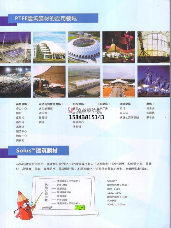 艾美PTFE膜材,本產(chǎn)品具有很好的柔韌性及高抗拉、抗撕裂強度,超細玻璃纖維絲織物基布(3-5微米絲徑)涂層PTFE (聚四氟乙烯),在 -50℃到+200℃溫度范圍內(nèi)安全使用,具有良好的耐熱、耐濕等特性,同時提高了產(chǎn)品的抗彎曲、抗折、抗磨損性,使用壽命可達25年甚至更長的時間。