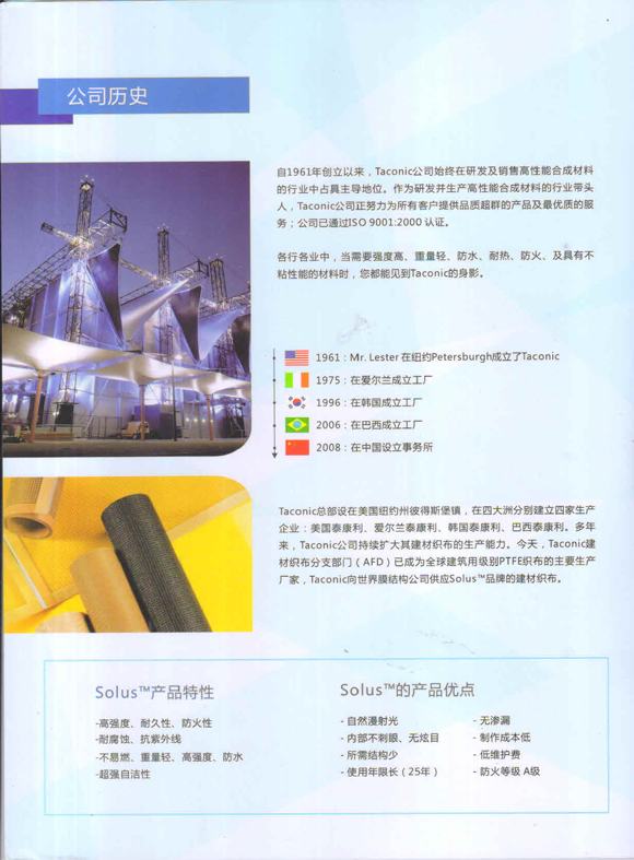 十多年來,Taconic公司持續(xù)地擴 大了其建材織布的生產(chǎn)能力。今天,Taconic的建 材織布分支部門](AFD)已成為全球建筑用級別PTFE /織布的主要生產(chǎn)廠家,Taconic向全世界織布結(jié)構(gòu)公司供應(yīng)Solus 品牌的建材織布。借助于我們在歐洲,美洲和亞洲的產(chǎn)業(yè)基地,Taconic/AFD 通過其分布各地的加工,銷售和服務(wù)網(wǎng)絡(luò)向全球客戶群供應(yīng)優(yōu)質(zhì)服務(wù)。